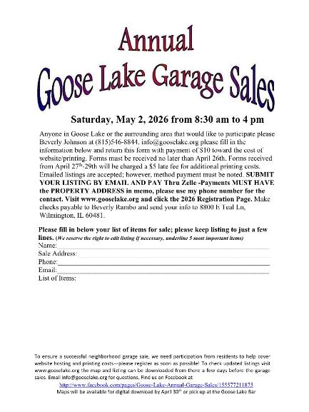 Click on the form to download a PDF file of the 2026 Registration form for the 2026 Goose Lake Annual Garage Sales or see the notes below for electronic submission. If you submit your listing through email be sure to have your garage sale listing paid by the deadline or your listing will not be published.